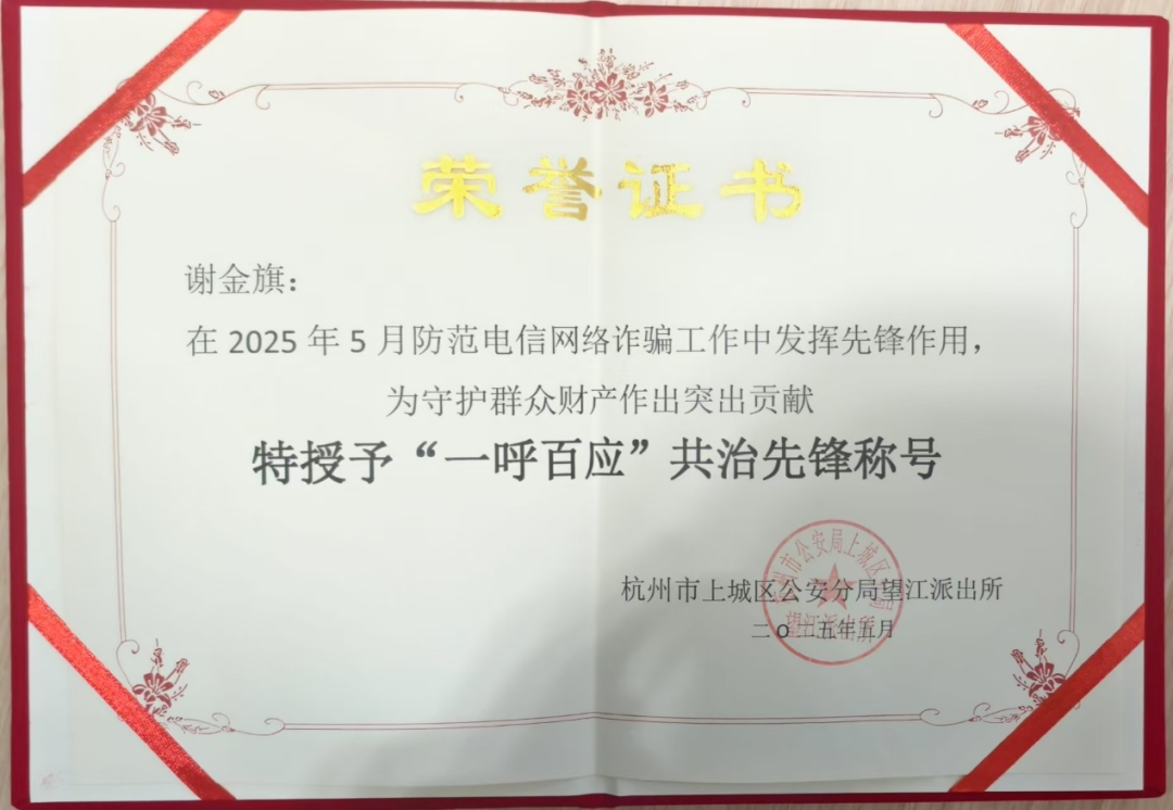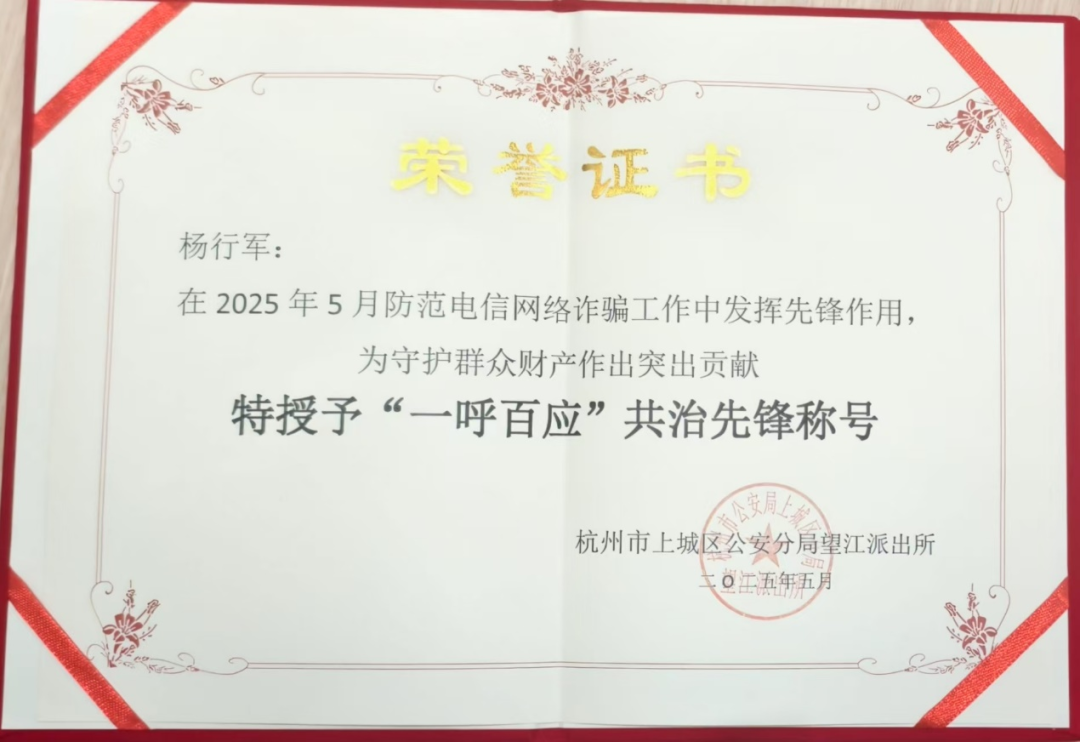 6月6日,杭州市上城区公安分局望江派出所肯定了杨行军、谢金旗二人在5月21日、30日两次反诈行动中累计拦截资金20万元、协助抓获3名嫌疑人的突出贡献,特别授予“一呼百应”共治先锋称号。平安银行杭州分行也向浙江德邦保安服务有限公司发来了表扬信。