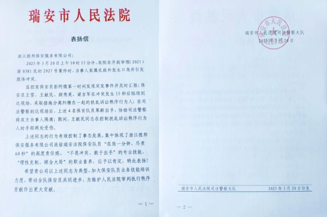 的迅速反应和专业处置有效控制了事态发展,获得瑞安市人民法院的表扬。同时,